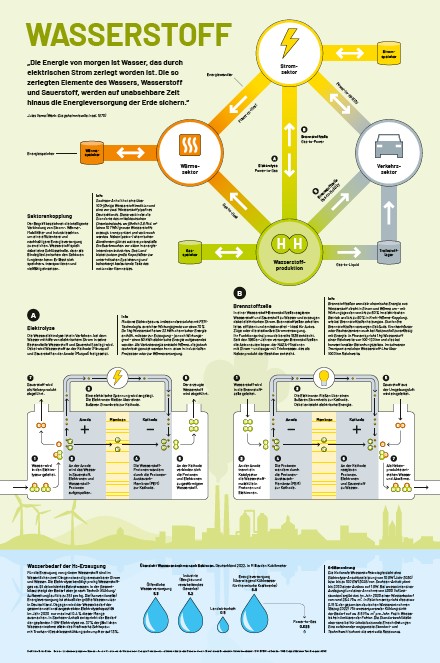 Wasserstoff spielt eine zentrale Rolle für ein zukünftiges, sektorübergreifend vernetztes Energiesystem. Unsere Infografik Wasserstoff zeigt, wie Wasserstoff mittels Elektrolyse aus Wasser gewonnen und in Brennstoffzellen wieder in elektrische Energie umgewandelt wird. Deutlich wird auch, wie vielfältig Wasserstoff einsetzbar ist – von der Strom- und Wärmeversorgung über Industrieprozesse bis hin zum Verkehr. Zudem wird sichtbar, dass grüner Wasserstoff effizient erzeugt werden kann und Wasser als Ressource dabei nicht zum limitierenden Faktor wird.