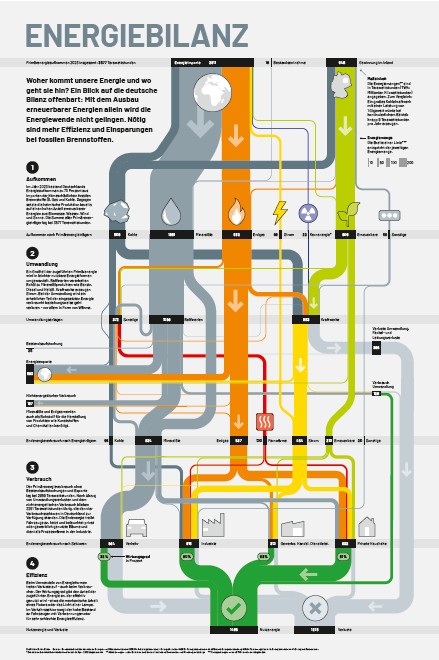 Infografik Energiebilanz macht sichtbar, woher unsere Energie stammt, wohin sie fließt und welche enormen Verluste beim Einsatz fossiler Brennstoffe entstehen. Eine effizientere Energienutzung, strukturelle Veränderungen der Energieerzeugung und -verteilung und der konsequente Umstieg auf erneuerbare Quellen bilden die zentralen Schritte einer nachhaltigen Entwicklung.