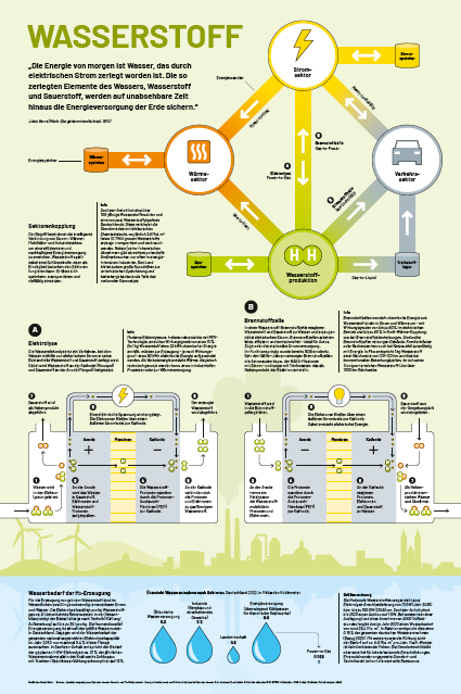 Die Infografik Wasserstoff enthält spannende Informationen zur Bedeutung von Wasserstoff als Schlüsselelement für eine nachhaltige Energieversorgung im Sinne der Sektorenkopplung. Es werden Aufbau und Funktionsweise eines PEM-Elektrolyseurs und einer PEM-Brennstoffzelle erklärt und Anwendungsmöglichkeiten beschrieben. Außerdem wird das Thema Wasserbedarf für die Elektrolyse vergleichend beleuchtet.