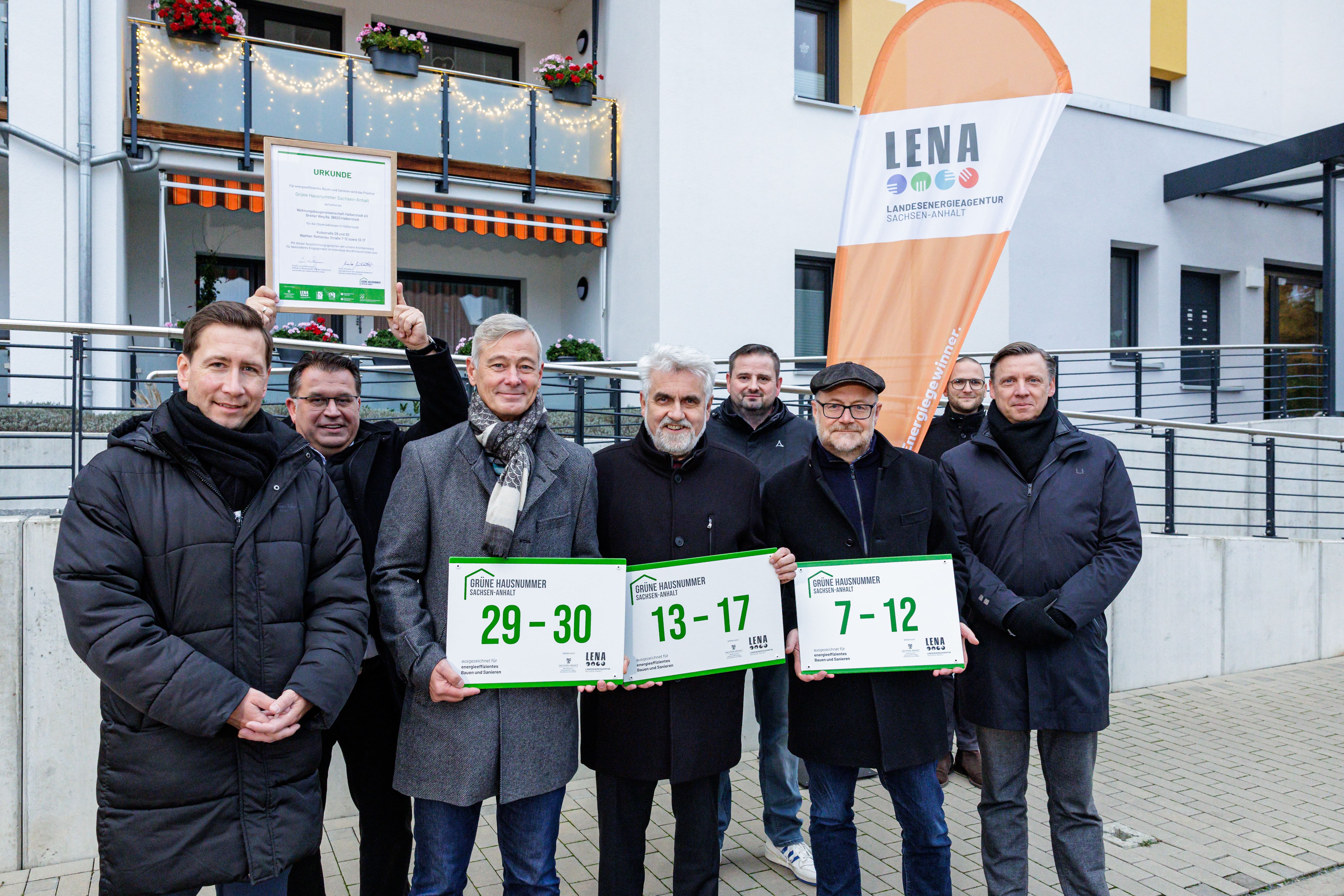 Überreicht wurden das individuell angefertigte Hausnummernschild sowie eine Urkunde als Anerkennung für besonderes Engagement im Interesse des Klimaschutzes durch Energiestaatssekretär Thomas Wünsch, Dezernent Guido Schmidt, die stellvertretende Geschäftsführerin der Ingenieurkammer Sachsen-Anhalt, Alina Bülter, und LENA-Prokurist Dirk Trappe.